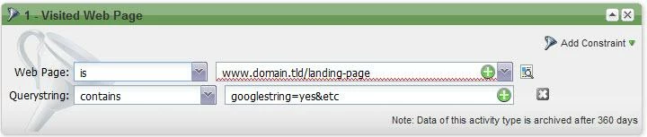 What I would like to do is set up Marketo to check if a banner is clicked on by a lead but the lead doesn't convert, but I can't seem to run a filter for "Visited Web Page" -> www.domain.tld/landing-page/?googlestring=yes&etc.
