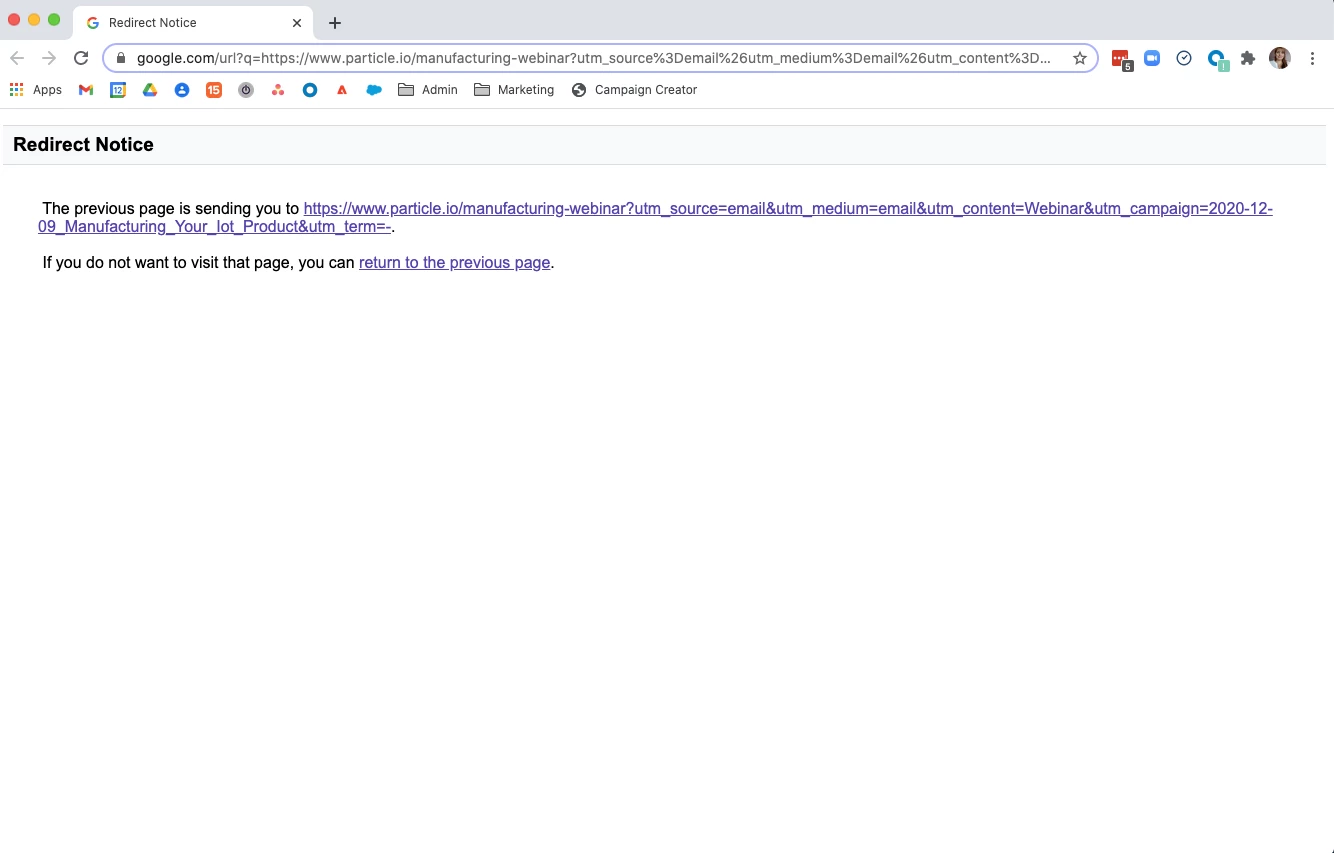 Since this morning, whenever I click a link in a test email I send myself, google shows a Redirect Notice of the url that I've linked to, requiring folks to click again on the URL to navigate there.