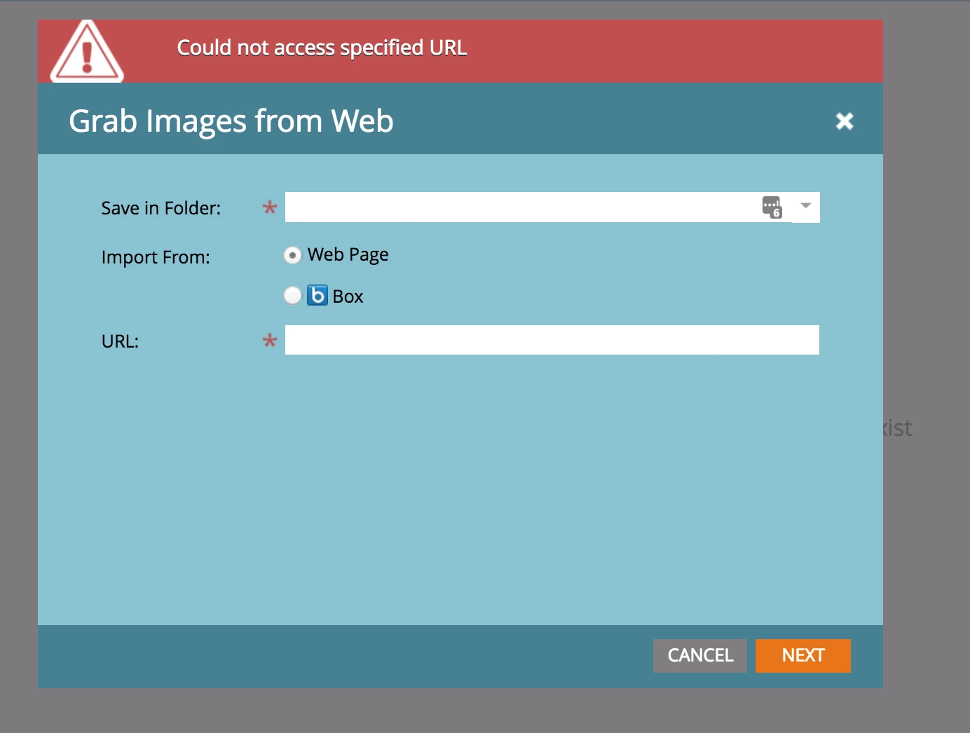 We have untidily dumped images onto a landing page so that we can use the "grab from web" function in the Design Studio under Images/Files. The Landing page is approved and accessible, however when we try to grab the images we encounter the error below. We are trying to migrate the images from one Marketo instance into another and were told this is the fastest means of doing so (versus exporting and importing).