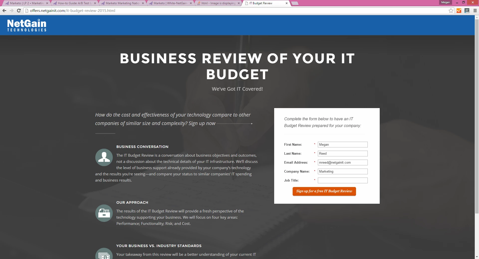 I just began downloading and using the Guided Landing Pages. They are very easy, which is awesome for someone like me with only basic HTML knowledge. The only problem I see is that they are displaying differently depending on the browser. It looks great in Chrome and Firefox, but IE causes the logo to look pixelated and a arrow image from Design Studio to almost disappear.