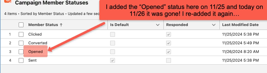 New update, when I went into Salesforce to look at my "Opened" status that I added yesterday, it was gone! Can Marketo delete member statuses that are in Salesforce??