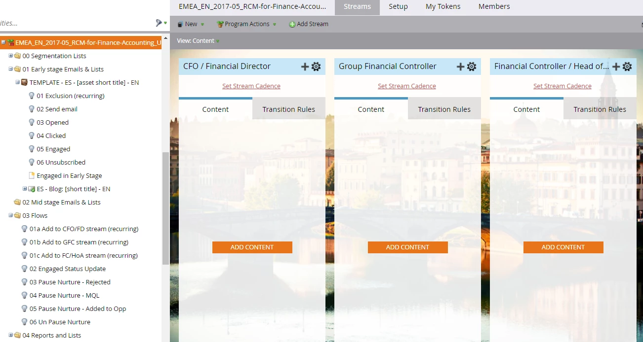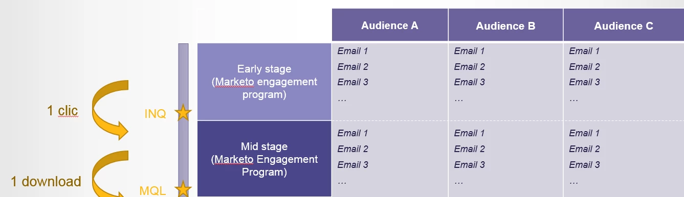 3 audiences are served different messaging/assets, with Early Stage and Mid Stage "streams". So far so good. The reason I'm separating early and mid stages is because I'd like to transition leads from one to the other when they engage in early stage (so if they click ES email 2, they skip the rest and go straight into MS). However if leads exhaust ES, I'll push them anyway to MS, so I'm wondering if there isn't a better way by putting all ES and MS emails into the same stream, and skipping ES emails when leads engage? If so how to build that "skip" flow in a simple manner?