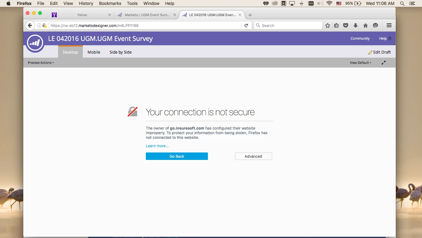 Now when I test the form to see if I will get redirected to the 'Thank You' landing page, I am redirected to my company's website. I checked to make sure the landing page is correct on the form and all items have been approved.