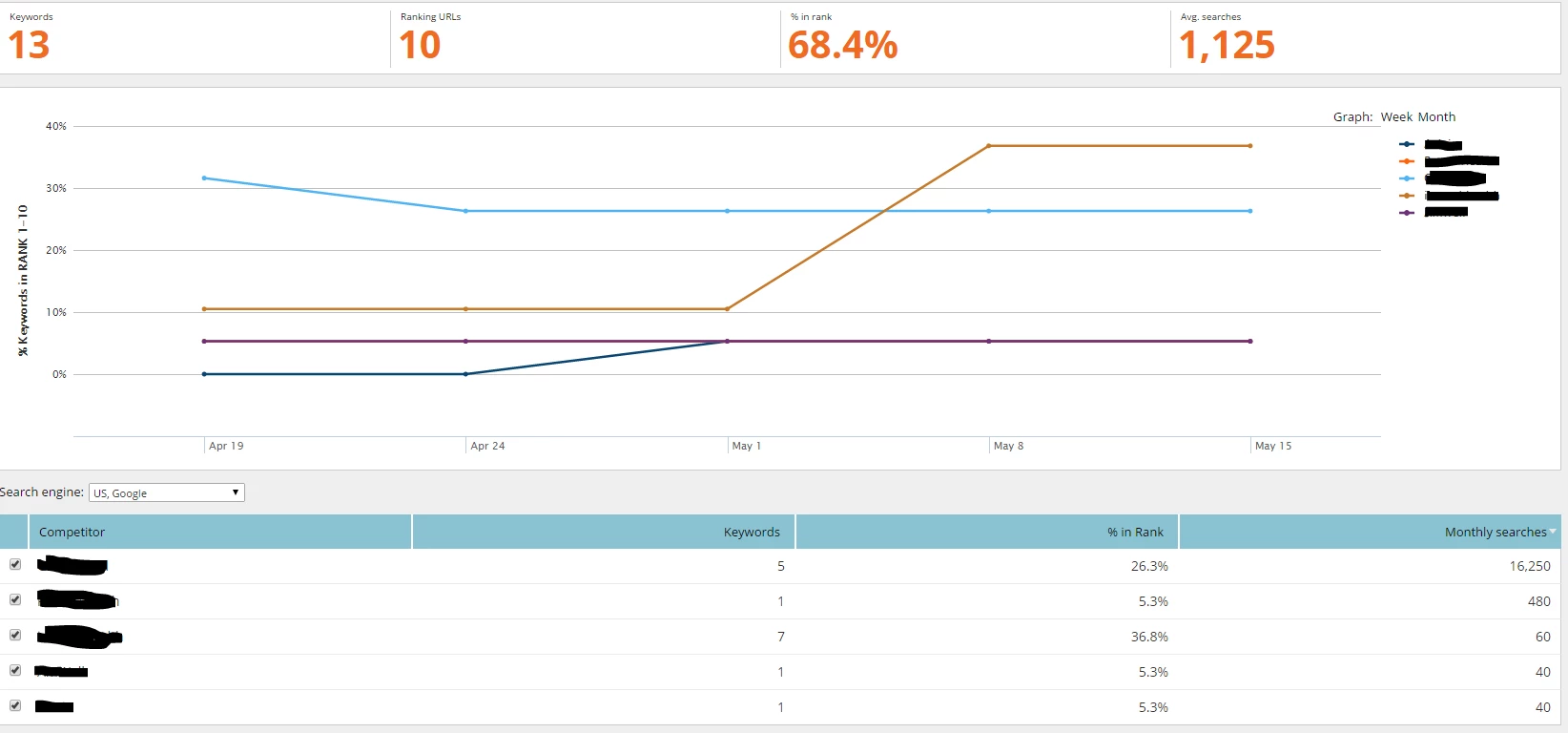 I gather that out of my company and 4 competitors, there were 13 keywords total and 10 that reached 1-10 on Google Search. Looking at the first competitor in the list they have 5 keywords and 26.3% in rank with 16,250 searches. QUESTION 1: Does that mean that the competitor has shown up on Google for 5 of my 13 keywords and ranked 1-10 26.3% of the time? QUESTION 2: Does that mean that this competitor showed up on rank 1-10 on google 16,250 from those keywords, or does it mean that the 5 keywords showed up 16,250 times in that month?