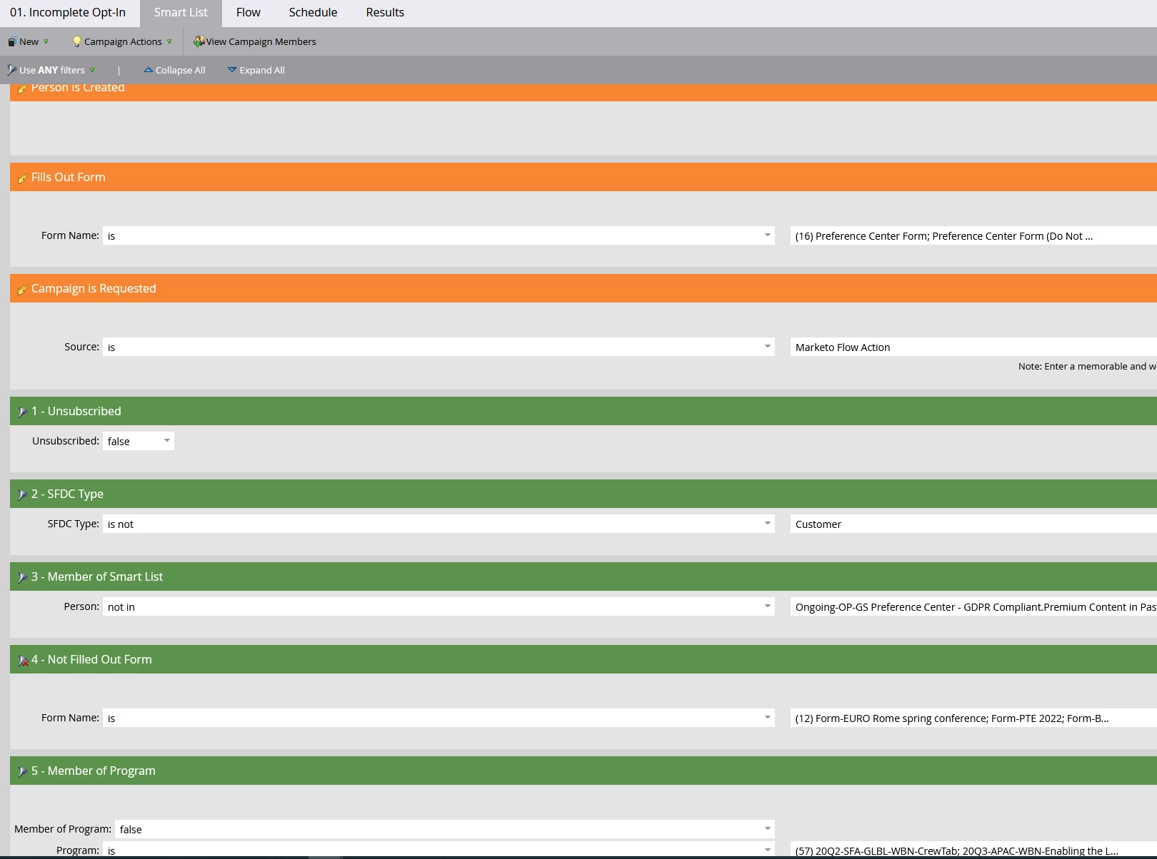 I want to exclude anyone who is unsubscribed + any customer contacts + anyone who is a member of a defined smart list or program, as well as anyone who filled other specified forms (different from those listed under trigger; used filter not filled out the form).