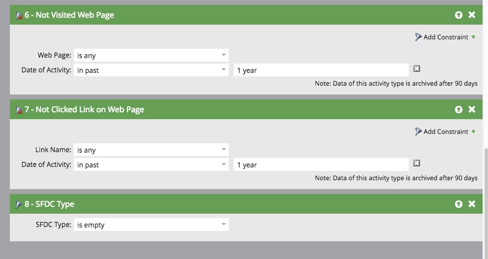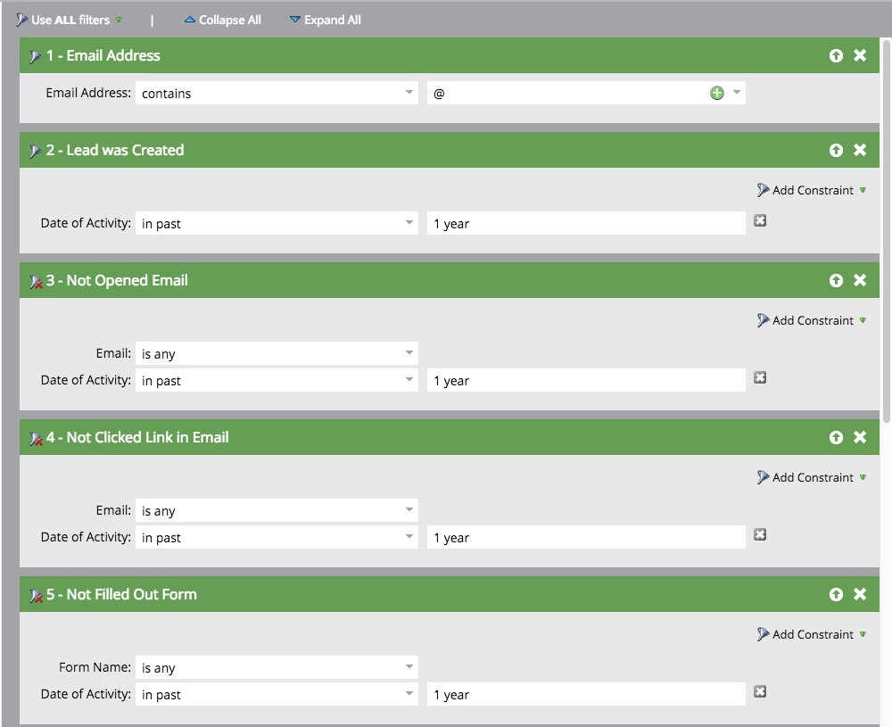 Any ideas on how to best create a smart list reflecting inactive leads for the past year? Here's what I am using and I'm not sure about what I'd need for Lead Created, if at all? Thanks for any help/suggestions you might have.