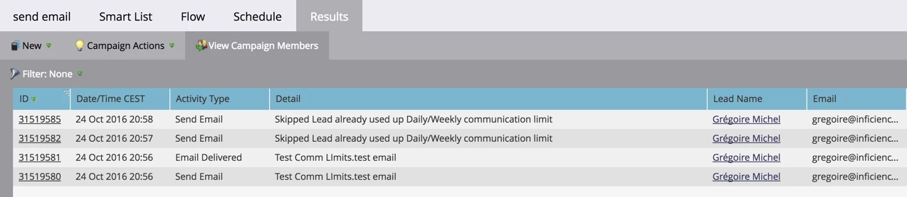 - Option 1. Marketo recognizes jsmith@abccompany.com as being sent an email on 11/1. No emails are sent because of the Communication limit (Ideal)