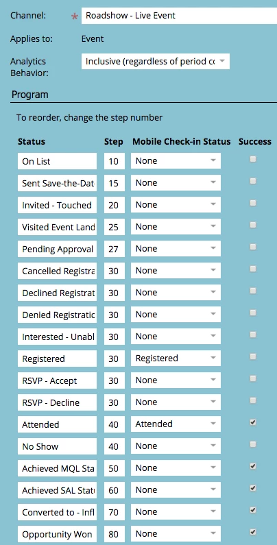 When looking at the members of the event program, it will only display the current program status for each lead. So in this case, you'll only see "attended" (even though they also once had a status of "registered"). Defining program statuses properly is one of the most important steps you should take before executing any activity out of Marketo. It's the basis for how your leads progress through your lead lifecycle and on to sales readiness. Here are the program statuses that we use for the live event channel: