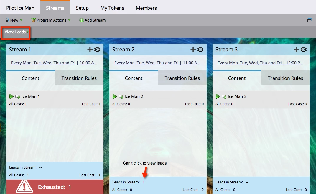I'm building out a Nurture Stream and want to know which leads are currenly in each stream. If I click "View: Leads" from the menu, I can see the # of leads in each stream, and I can see the leads that received each cast, however, I can't see the leads that will receive the next cast?