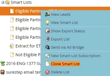 I have an Email Send Program that I want to repeat with some changes. I cannot seem to find the option to clone the "master" (?) smart list.