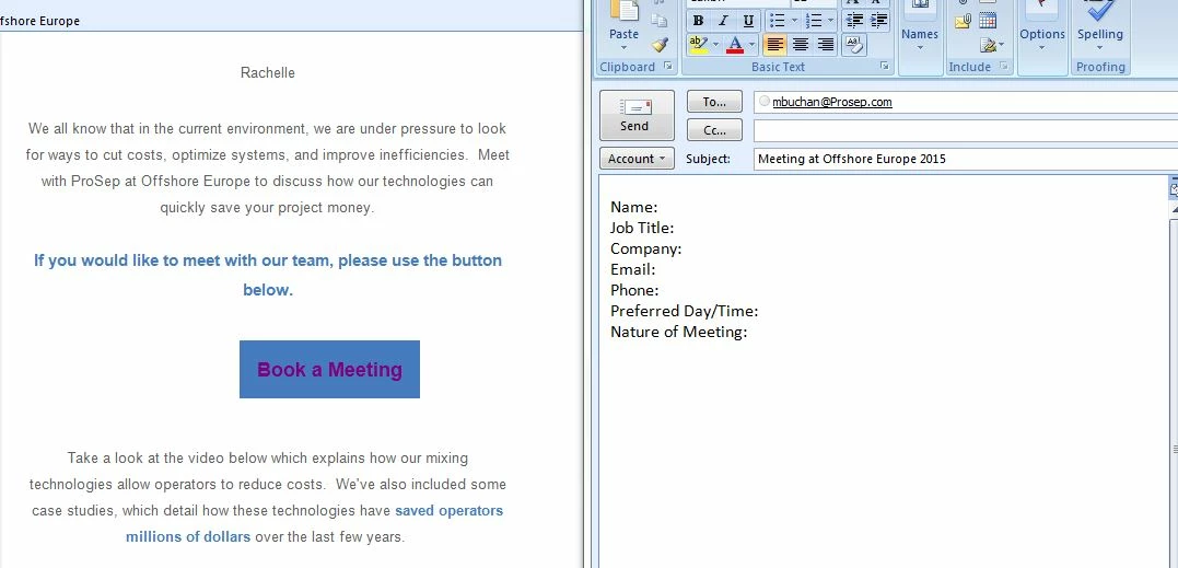 My company is sending out a email communication for an upcoming event we have. I would like to include a button inside the email that when recipients click it a email will pull up that they can fill in information and request a meeting. Like the attached screen shot in an email I received. I am wondering how can you create such a function in a Marketo email communication? Thank you.