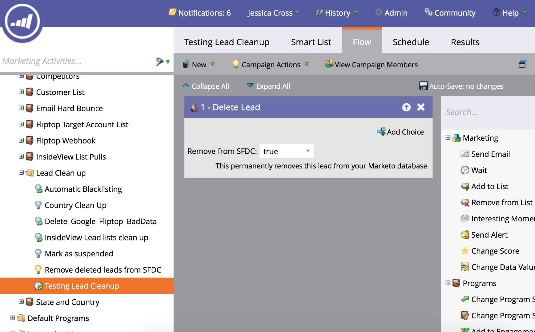 My first step was the narrow down how leads entered the system. Do this step first as it is pointless to clean up the database without stopping how dirty data enters the system. For me this meant switching out all the forms on the Fliptop website and the blog from a Salesforce web-to-lead to Marketo forms. Marketo automatically de dups leads if the email addresses match. Salesforce does not. I had a bit of a problem with my engineering and customer success teams entering test leads into the system to test our own predictive scoring. I first cleaned up all those test leads and then built a data management campaign to go through on a monthly basis to delete test leads.