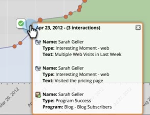 For any opportunity, Marketo will show the story of how that opportunity was influenced by marketing. The little red dots above are clickable, and are comprised of interesting moments and program successes.