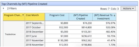Now, we can aggregate the data. What if we want to know the total pipeline associated with all of the tradeshows? A multi-touch pipeline report by channel will return the total sum of (MT) pipeline associated with each channel.