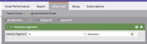 Of course, you can always create an Email Performance Report or an Email Link Performance Report to understand the performance of the overall email, but what if you want to understand how each dynamic variation performed? Here’s the easiest method. First, create an Email Performance Report. In the Smart List, add a filter referencing a specific segment: