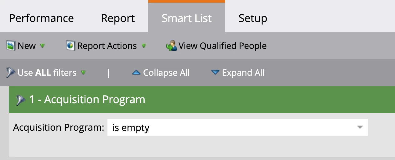 To assess the volume, head over to the Database section of Marketo and run the System Smart List titled "No Acquisition Program". Double check that the filters on the smart list haven't been modified. The filters should look like this: