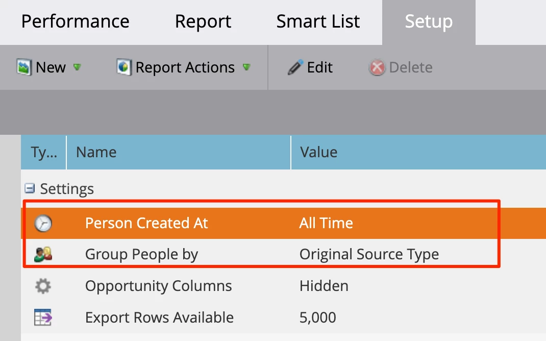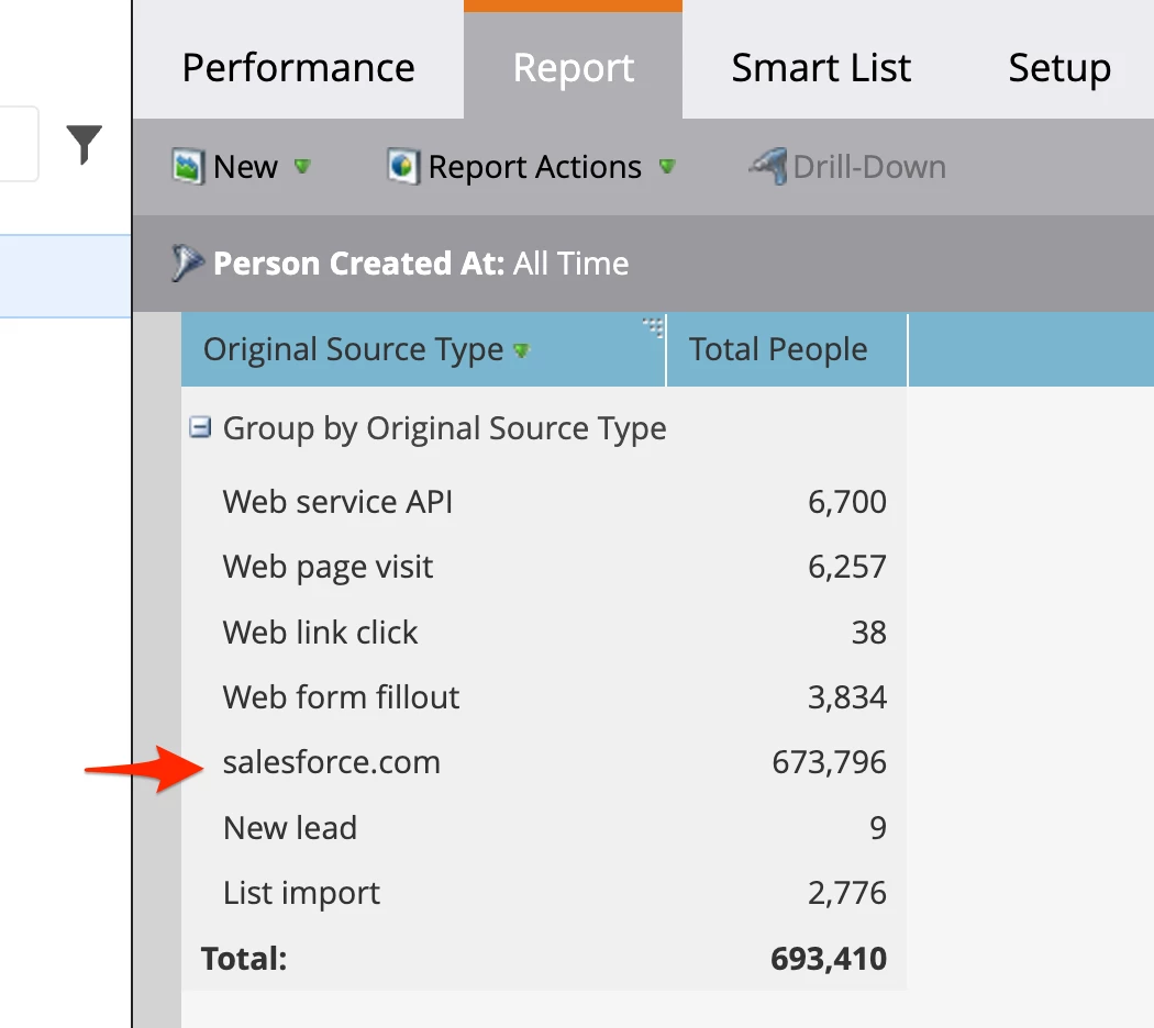 Now, let’s get an understanding of where these records are coming from by Grouping by Original Source Type in the Setup tab. You should also expand the date range to All Time. It should look like this: