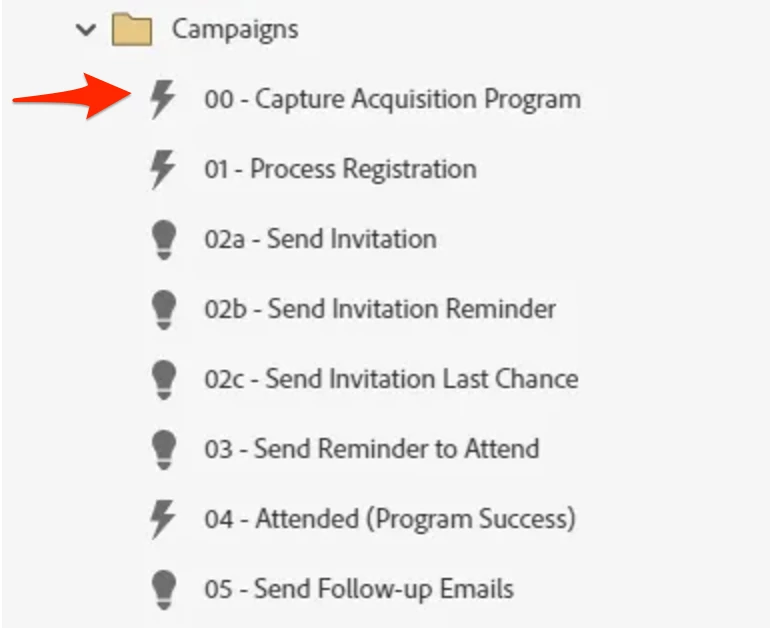 Check out Marketo’s Best Practice Program Template Library if you’re new to Program Templates. There are several starter templates built out that you can import to your Marketo instance and adjust as needed. These Program Templates will include Smart Campaigns for AP where appropriate – the Event Program Template is a good example.