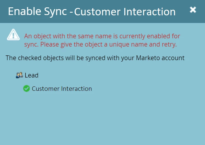 When I enable the sync of Customer_Interaction in MKTO for the first object (either Lead or Contact), it works perfectly. However, when I attempt to enable it for the second object, MKTO returns the following error message: