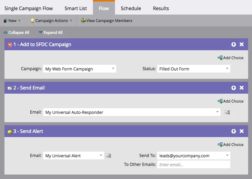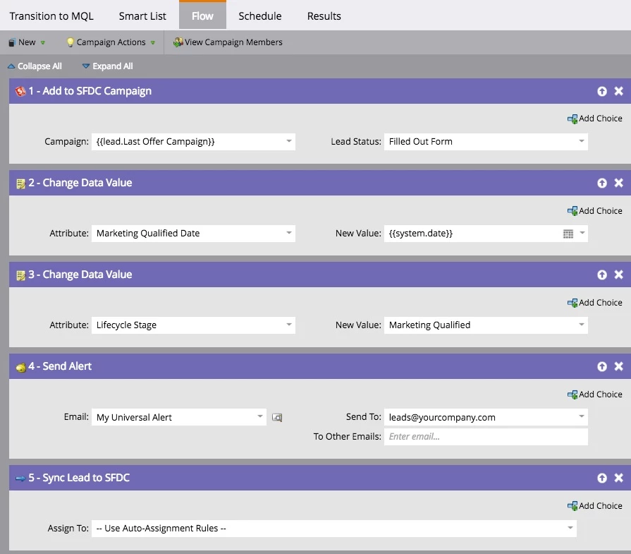 Instead, create a single MQL processing campaign in your lifecycle program that includes a sync flow step. Now you can now request it from anywhere you want, maintain one version of the process, and control when and how someone enters that flow.