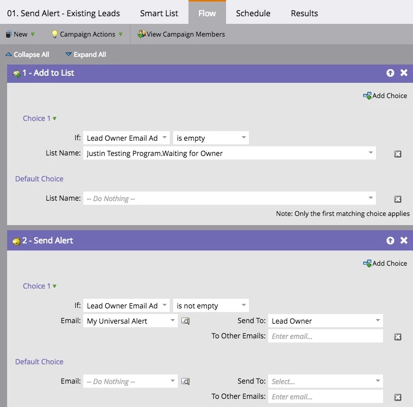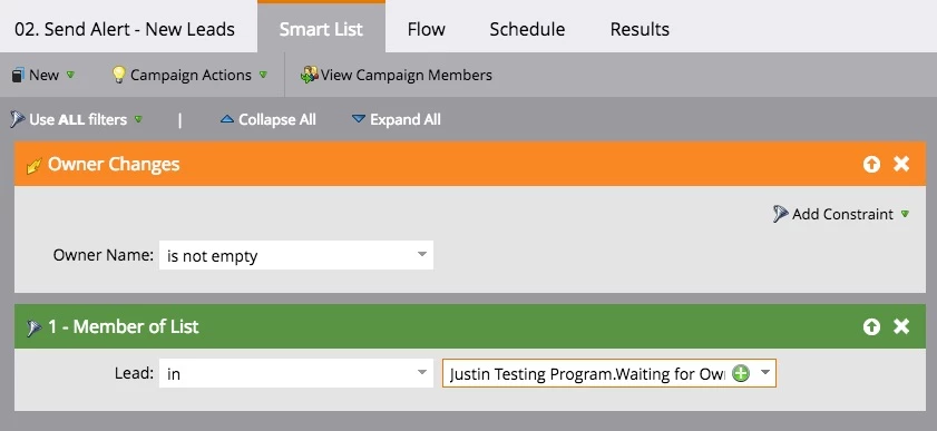 The first campaign checks if the lead has an owner; if it does, the alert is sent, and if not the person is added to a static list to identify them as someone waiting for an owner.