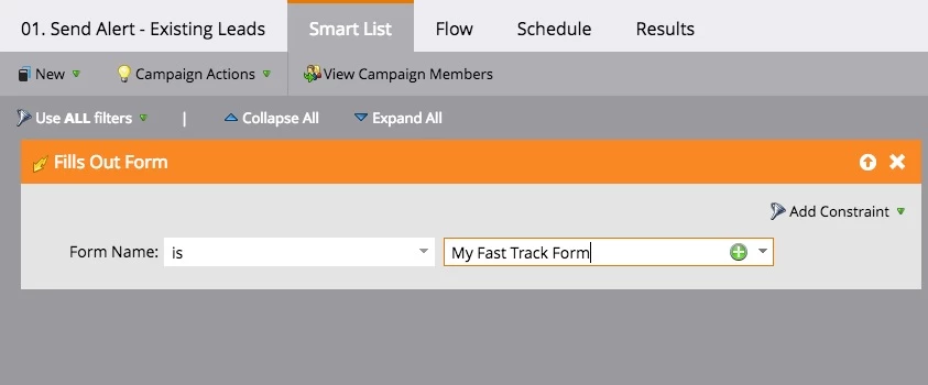 When a lead fills out a form, you want to add the lead to a Salesforce campaign, send the lead a thank-you email, and then send an alert to distribution list. All these steps happen in quick sequence and have no other dependencies outside the campaign. So based on these requirements, a single smart campaign works very well.