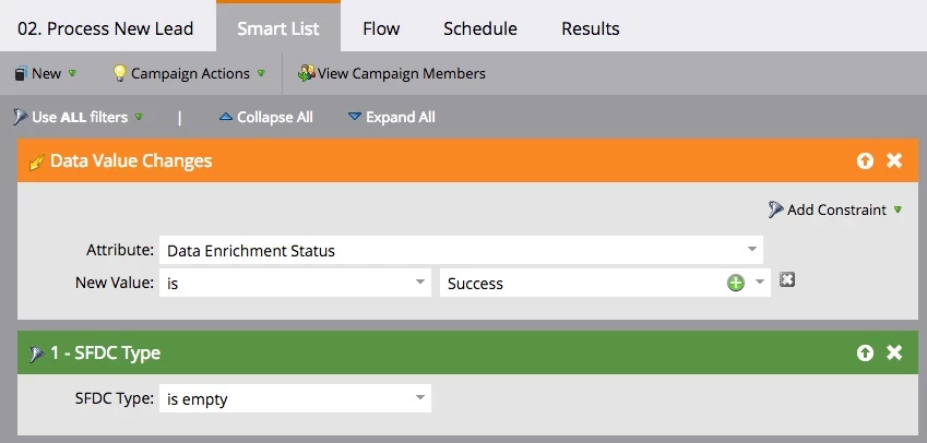However, at first you run into some problems. Both your data enrichment webhook and your lifecycle flow for new leads trigger off of “lead is created.” You need to find a way to make sure that the leads are not sent to Salesforce until the data enrichment webhook has finished pushing in data. This can happen almost instantly or take 1-2 minutes depending on how the enrichment vendor’s API is behaving.