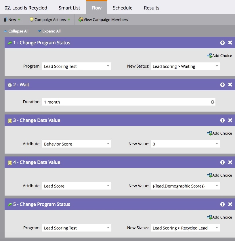 The second campaign triggers once the lifecycle stage changes to recycled. The lead is moved into a waiting program status for the appropriate period (30 days in this example). After the wait, the scores are reset and the program status changes again.