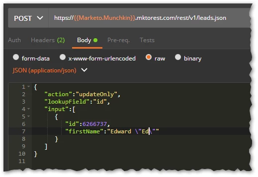 In above example "Graham" is in double quotes. So, Marketo API throws invalid JSON format error. Could you please help me in handling this issue?