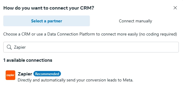 When searching for Marketo within the partner section of Facebook's setup process, it directs you to LeadsBridge. We also saw that Zapier is something that we could potentially use. (Both Shown Below)