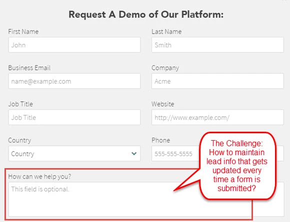 Here, the Comments field is prepended with new information after the person fills out a Contact Us form. The previous intelligence is maintained instead of overwritten.