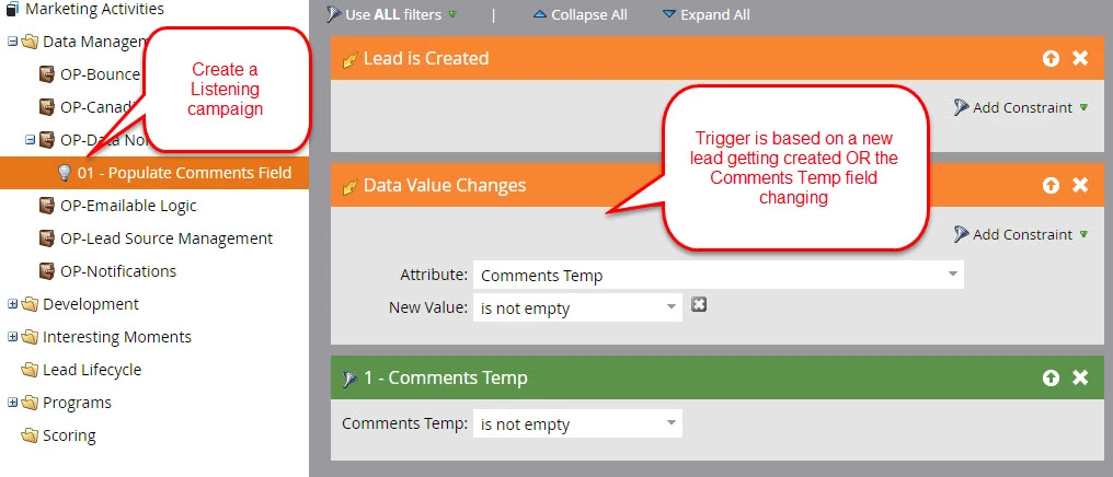 When: The campaign fires upon any of the updates you made in step 3--for example, when a new lead is created and the Comments Temp field is populated. It also fires when there is a change in value to the Comments Temp field.