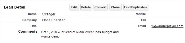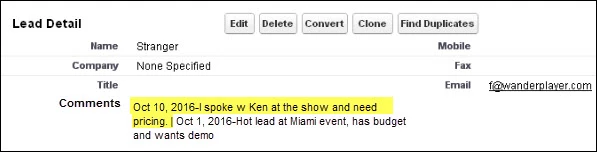 The Comments field is populated on 10/1/2016 when the lead is created from a trade show import.[/caption]
