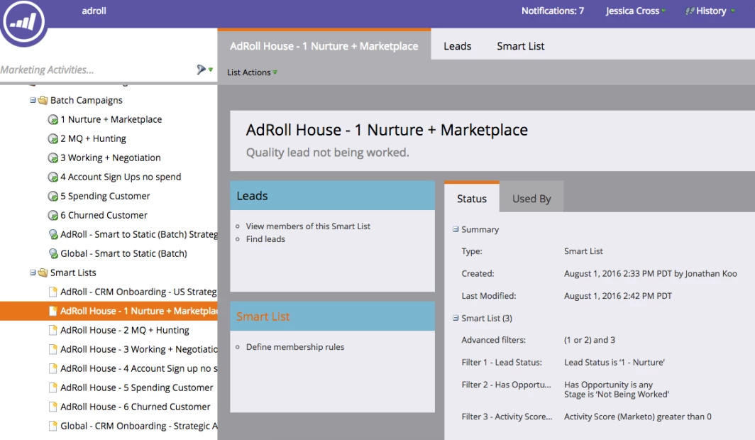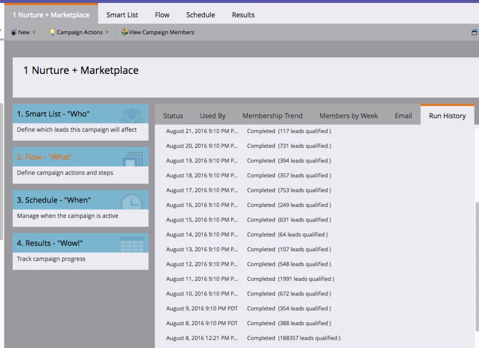 First step is to make a smart list with exact criteria you want. Whatever tickles your fancy. In this screenshoot I have a smart list that contains all the people in Nurture status, meaning they are at the top of my lead lifecycle.