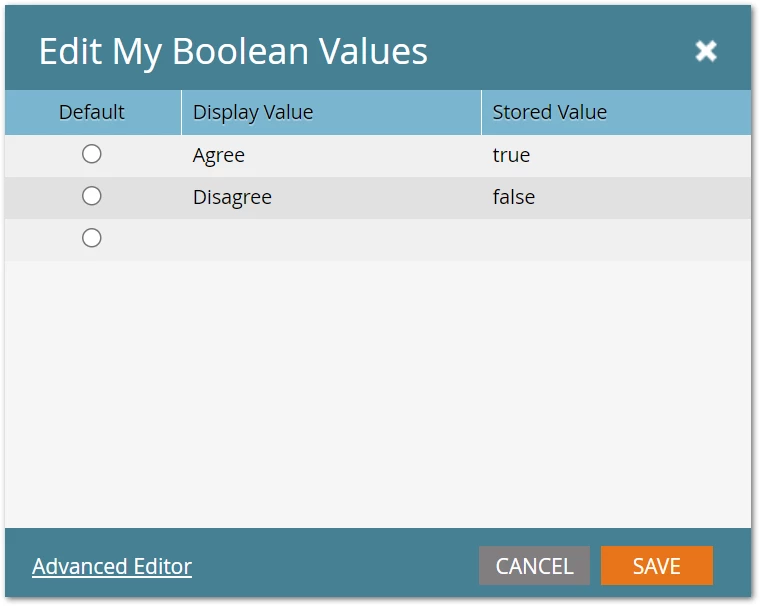 - Option 2: Display Value: "Disagree", Stored Value: "false"