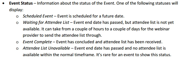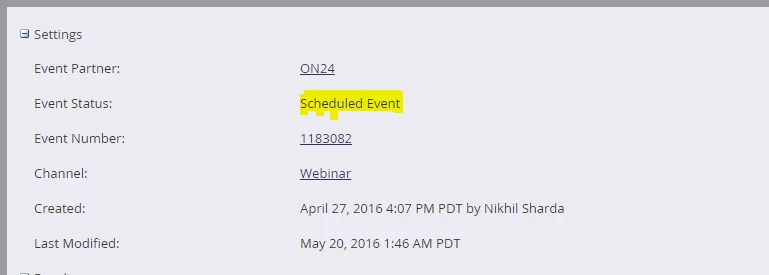 I want to pull event details from Marketo which are integrated with On24. Like shown in the below snapshot, this event is associated with On24 and I want to pull details like Event Status using Marketo API. I am able to pull details like Channel and Created Date using Program API but it does not return Event Status in the response. Can someone provide me a way to pull Event Status field using Marketo API call?