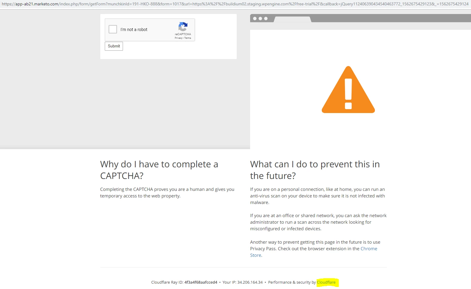 So please anyone help me how to remove that "I am not a robot" (security by cloudflare) captcha page from my marketo forms.