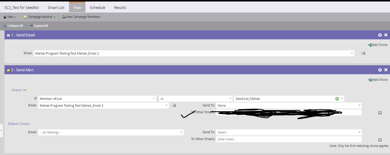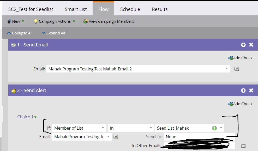 Issue is Marketo is not considering the list calling in the flow step and only sends alert to those members who have been added in the "To Other emails":
