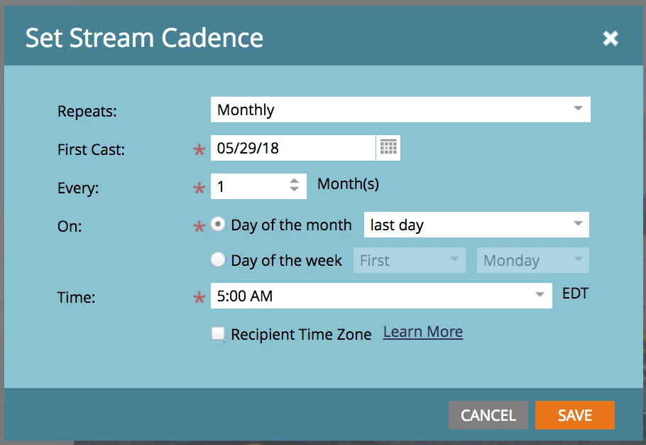 How to set stream cadence on last day of the month and only on weekday.