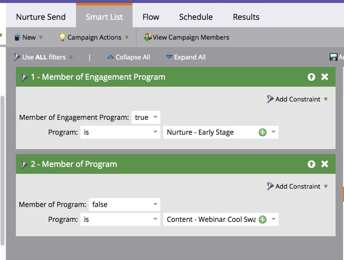 You may be tempted to drag other filters in the smart campaign smart list. Resist the urge. They will not work.* When you use other filters, member of list not in XYZ (and these folks are not members of the Content - Webinar Cool Swag program, those people who you want to exclude will be excluded from the nurture email, BUT they will not get another email. They will be stuck in email nurture purgatory. You have to turn the cadence off then back on for them to leave purgatory. There have been lots of articles written on this.