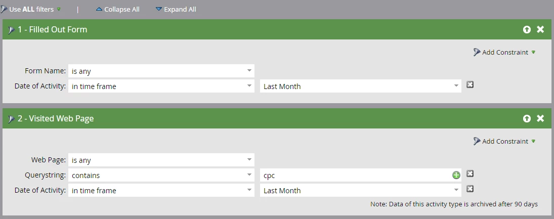 The part I am having trouble with is tracking the people who have visited out web page with CPC and then later fill out a form. I have screen shot below of the filters I am using. The issue that I have is that there is no chronology to this. Essentially, this is showing the correlation. People who filled out the form and visited the web page with CPC in the parameters. We have seen cases where a person filled out a form and then a few days later visited a CPC page.