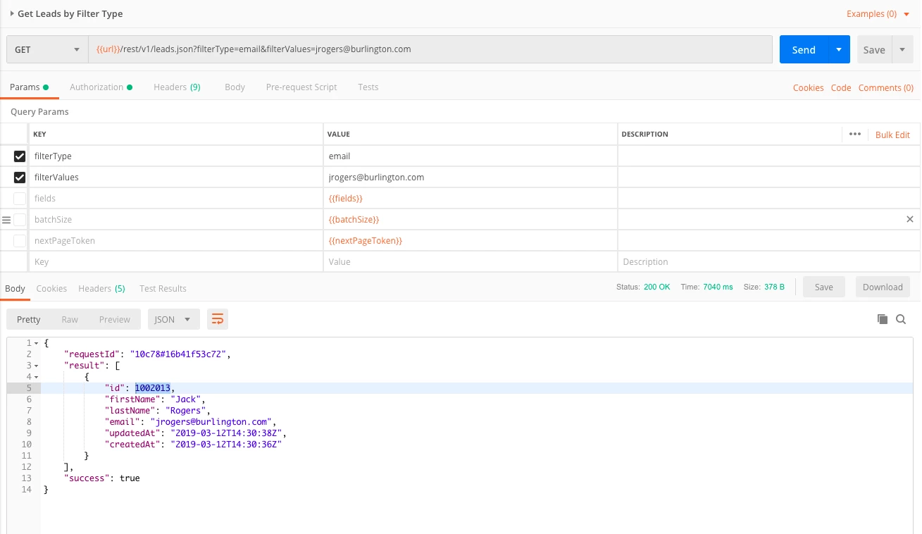 In order to update the right Person record, I'll need the Marketo Person ID for that person. I can get that using the Get Leads By Filter Type endpoint like this: