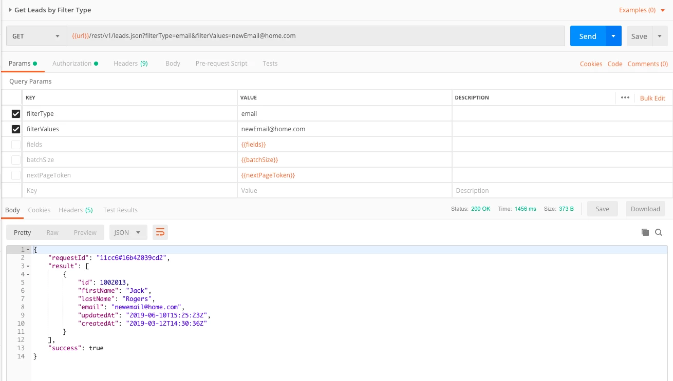 To verify that the email address was changed, I can make the Get Leads By Filter Type call again and pass the new email address.