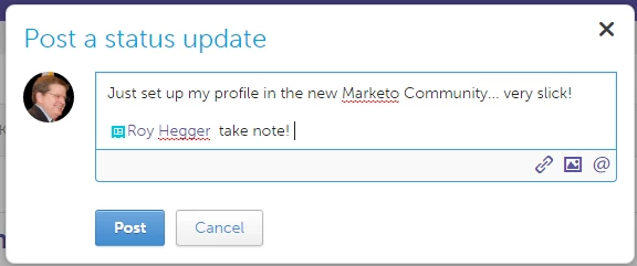 Note that you can @ mention other people in the community, include a picture or link out to other resources from within a status (the links at the bottom).