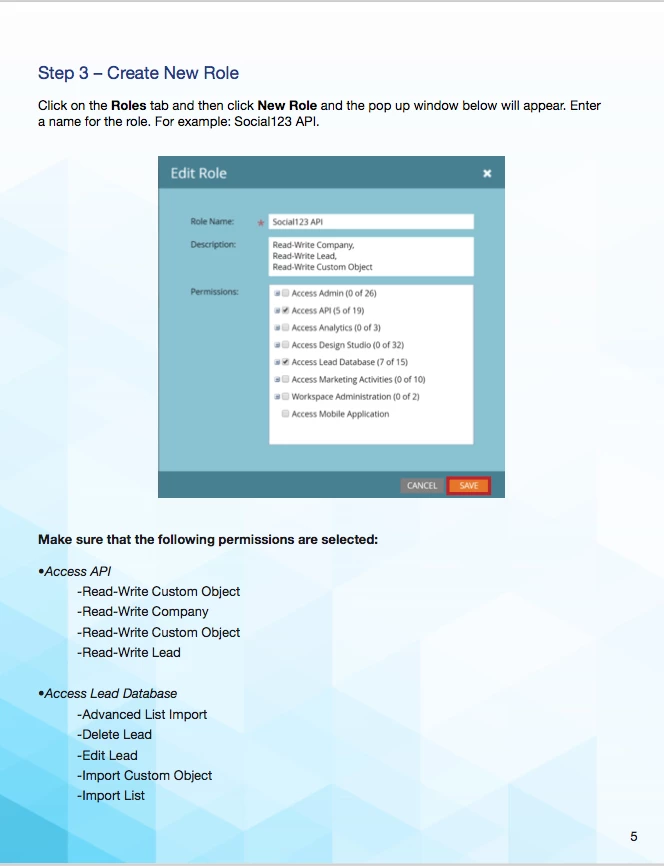 I have attached two screen shots. One is my admin instance when trying to "create a new Role" and the other is Social 123's instructions for connecting the API. I have admin privileges and all the above as I am the one that purchased the service, so that's not it. I have Spark addition, could that be it. I do not have a "New Roles" tab in order to create and start this integration. My instance was purchased in February of this year if that makes any difference. Anyone know how to fix?