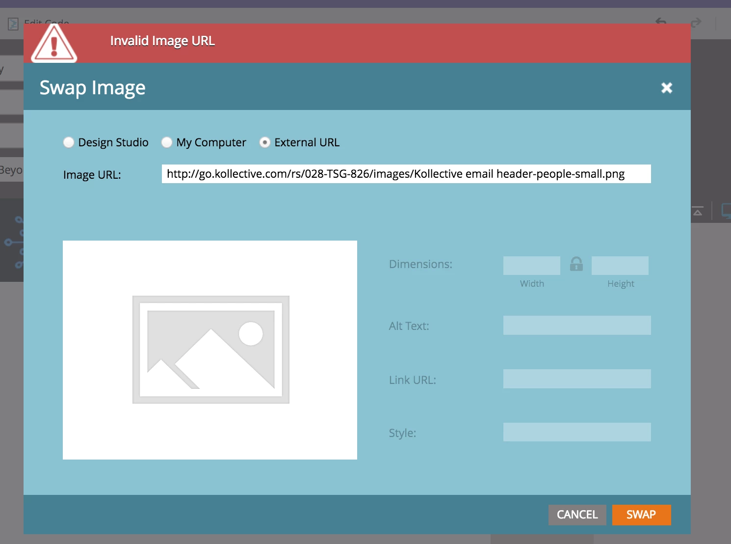 Hi Everyone, I am facing an unexpected error while creating an email draft. While trying to add any image in the email template, I am getting the error " Invalid Image URL". Can you help me understand why this may be happening and what can be done to resolve this error?