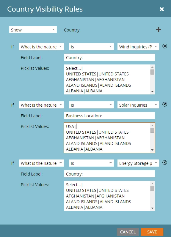 The customer would like "United States" to be the default value only when "solar inquiries" is selected. I am using "USA" so it'll be different from "United States" already in the picklist. The "Business Location" label is showing on my live test page, but the default value "USA" is not. There just is no default value in that dropdown. I tried adding "USA|USA" to the original field values list for the Country field, but that made no difference. Is this even possible?