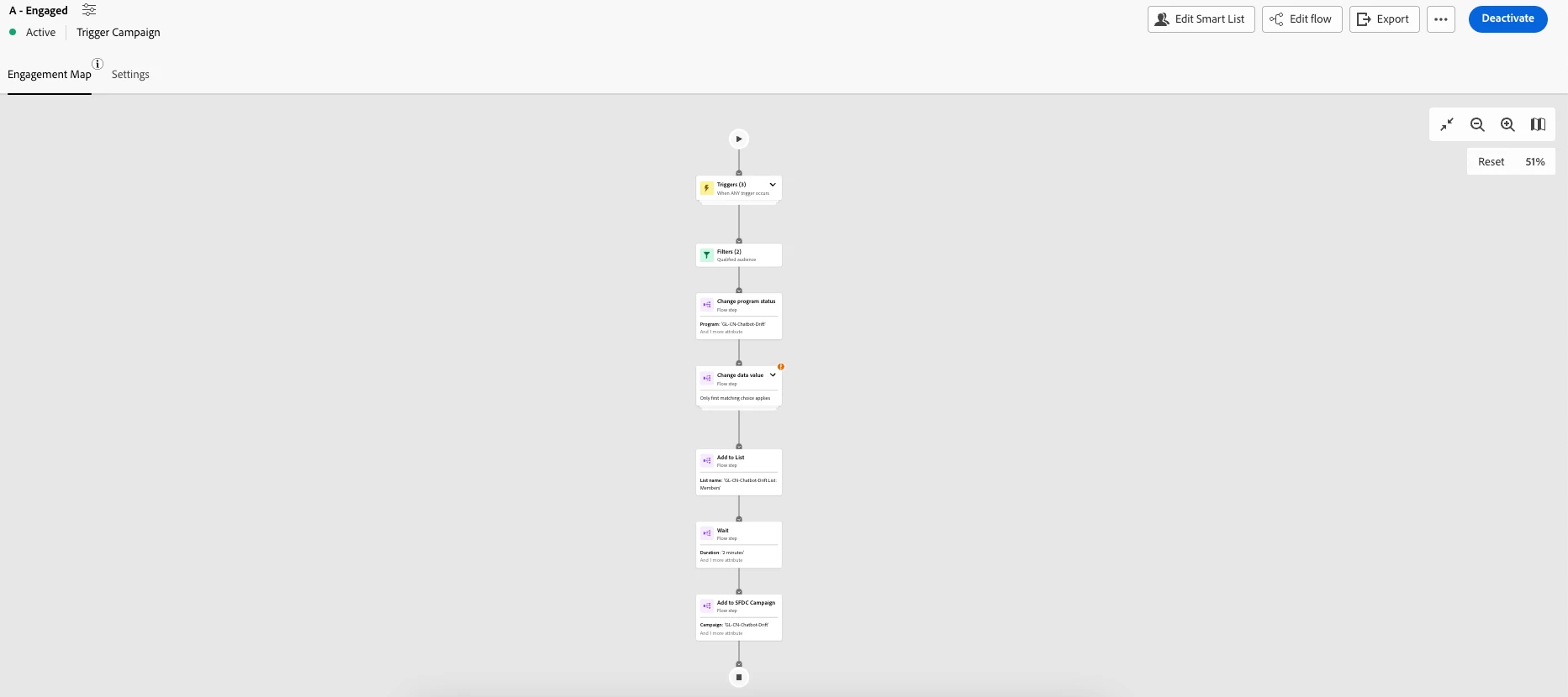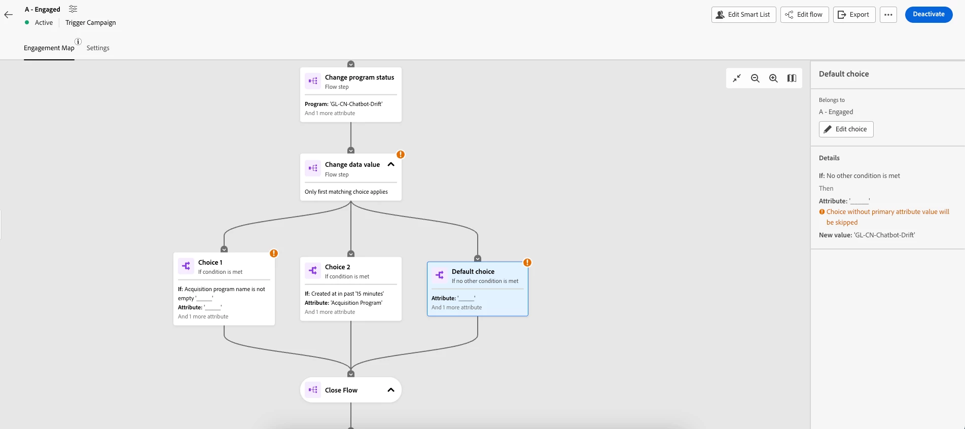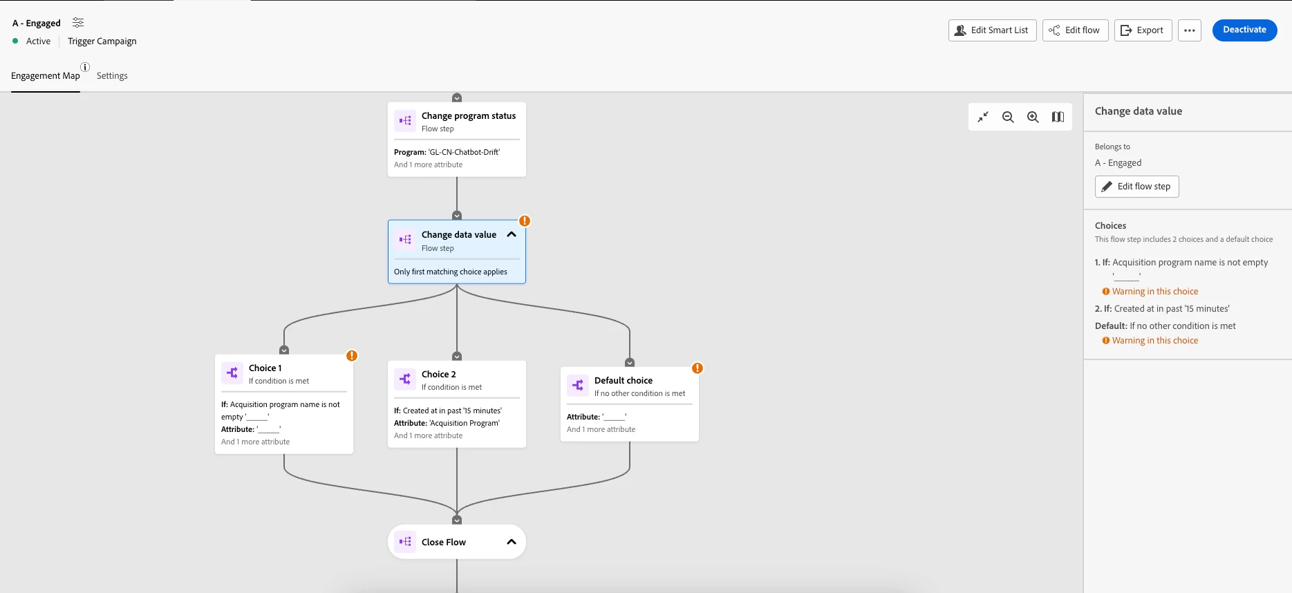In Engagement Map's Change Data Value flow step has an error for Drift Chat Box program
