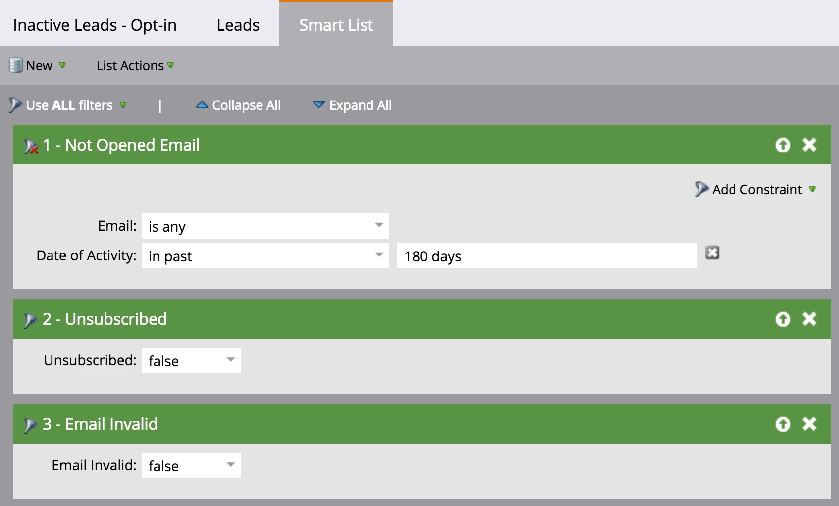Since our company recently got blacklisted (due to an unfortunate moment where someone accidentally sent an email to our entire lead database), we are trying to get off of the list. Marketo suggested that we send an opt-in email to those leads that have been inactive for the past 3-6 months to update their preferences. I created a Smart List to capture these leads but the number seems a little too high to me. Are these filters correct?