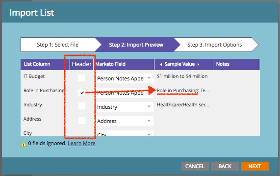 I frequently upload lists that have multiple columns of specific answers to specific questions. It's not worth creating fields for each question, instead is better to append them all to a Person Notes field that goes to SFDC for Sales to see. Unfortunately List Import doesn't allow the header to be captured on any field. But as long as I have a String or Text Area field, a checkbox to "Include Column Header" would save me editing multiple fields every time.